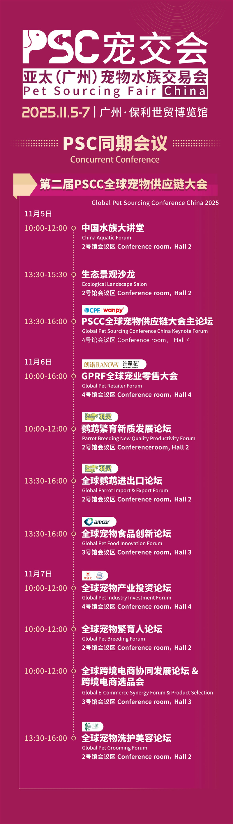 11 high-concentration professional conferences will be held concurrently, with 70+ global industry leaders sharing their insights. The 2nd PSCC Global Pet Supply Chain Conference will feature popular topics such as food innovation, industry investment, cross-border e-commerce, breeding, and grooming. The GPRF Global Pet Retail Conference will directly address retail pain points. The sub-sectors will also be full of highlights, including the China Aquarium Lecture Hall and the Global Parrot Import and Export Forum, precisely covering the aquarium and small pet sectors. Covering all dimensions of needs from practical technology to strategic planning, this exhibition provides cutting-edge ideas and solutions for the development of the pet industry. The specific arrangements are as follows: