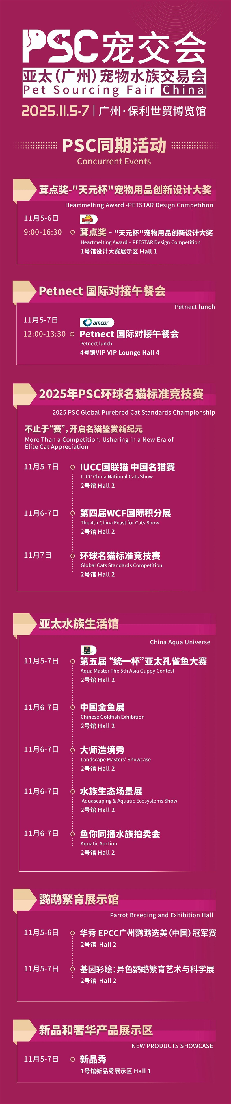 Featured Competitions: The 2025 PSC Global Cat Standard Competition will be held from November 5th to 7th in Hall 2, including the IUCC National Cat Show (November 5th-7th), the 4th WCF International Points Show (November 6th-7th), and the Global Cat Standard Competition (November 7th), ushering in a new era of pedigree cat appreciation; Themed Exhibitions: The Asia-Pacific Aquarium Lifestyle Pavilion will be presented in Hall 2 from November 5th to 7th, covering the 5th "Unified Cup" Asia-Pacific Guppy Competition, the China Goldfish Exhibition, Master Creation Show, and Aquarium Ecological Scene Exhibition. The "Fish and You Broadcast Together" aquarium auction will be held concurrently on November 6th and 7th; The Parrot Breeding Exhibition Hall will host the Huaxiu EPCC Guangzhou Parrot Beauty Pageant (China) Championship in Hall 2 from November 5th to 6th, and the "Gene Painting: Art and Science of Different Colored Parrot Breeding Exhibition" will be held from November 5th to 7th, covering sub-fields such as aquariums and parrots.
